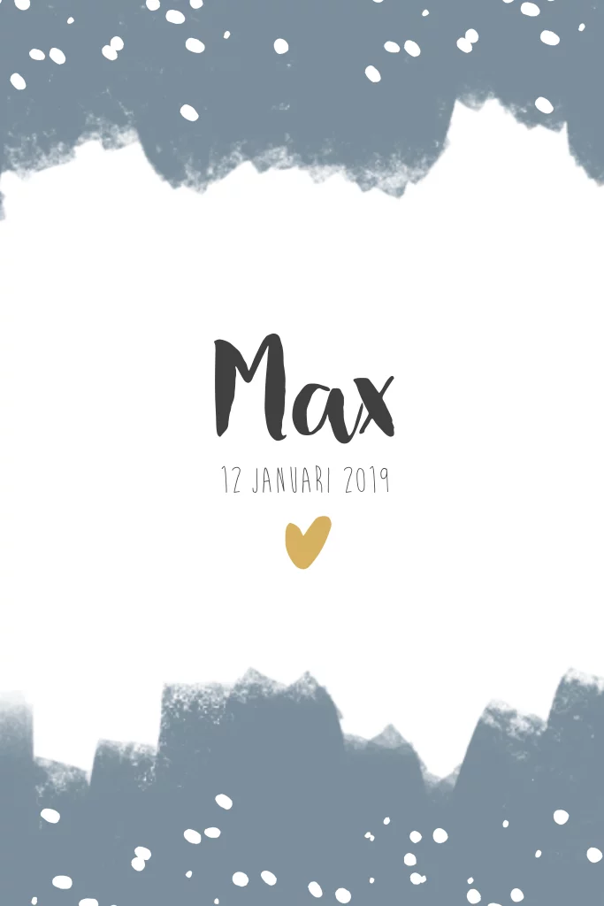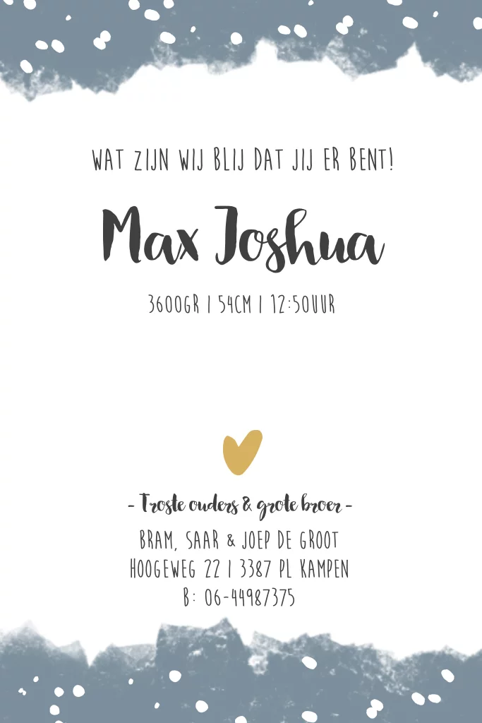Dit geboortekaartje met verfstrepen pas je helemaal aan naar wens. Het contrast van het de donkerblauwe verf en het goud / okergele hartje maken het kaartje uniek.