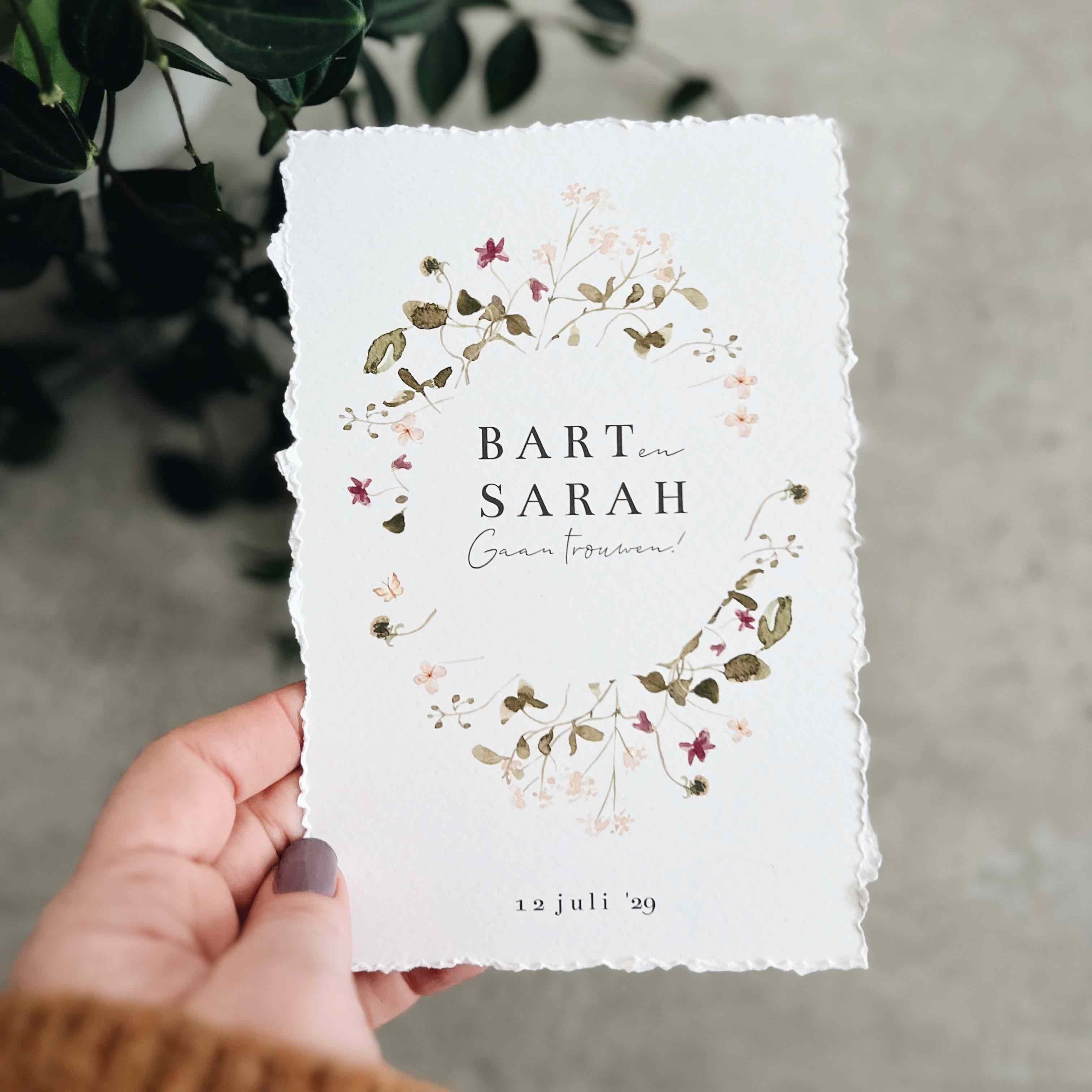 Trouwkaart met geschilderde bloemen met handgeschepte papier look
