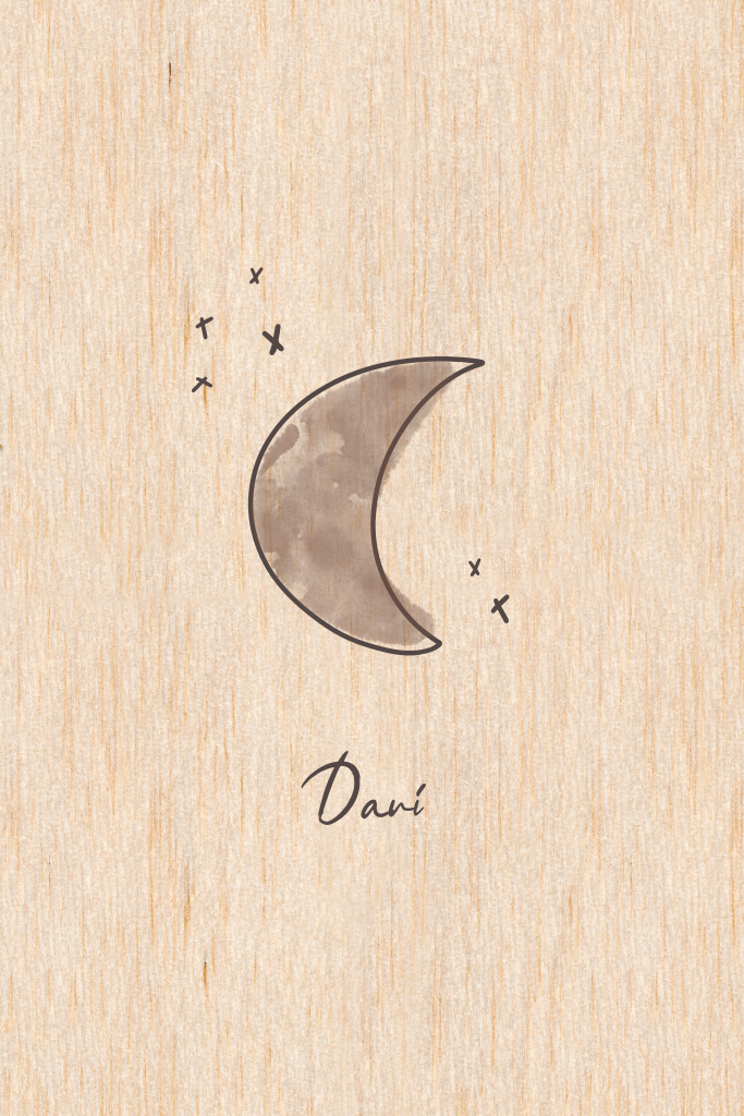 Dit geboorte-rouwkaartje op hout is unisex en kan dus voor zowel een jongen als een meisje. De lijntekening van de maan en de watercolour maan kun je aanpassen in kleur.