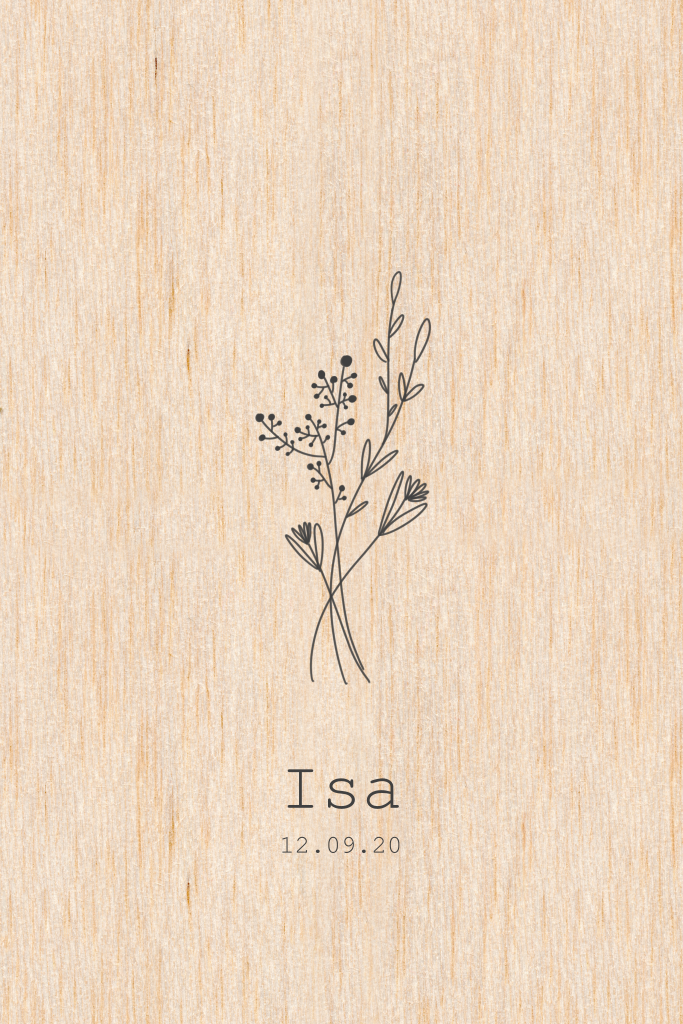Geboortekaartje op hout minimalistische met boeketje
