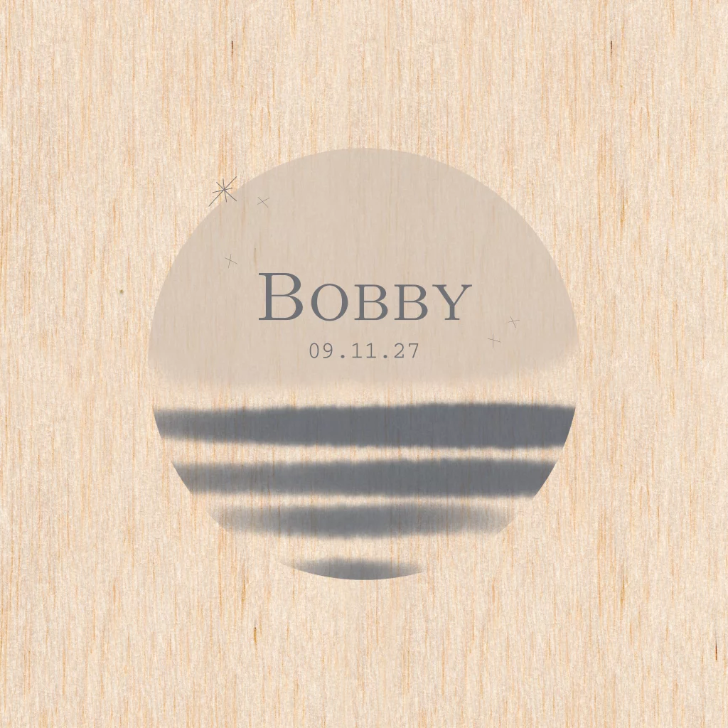Geboortekaartje jongen zonsopgang met sterren op echt hout