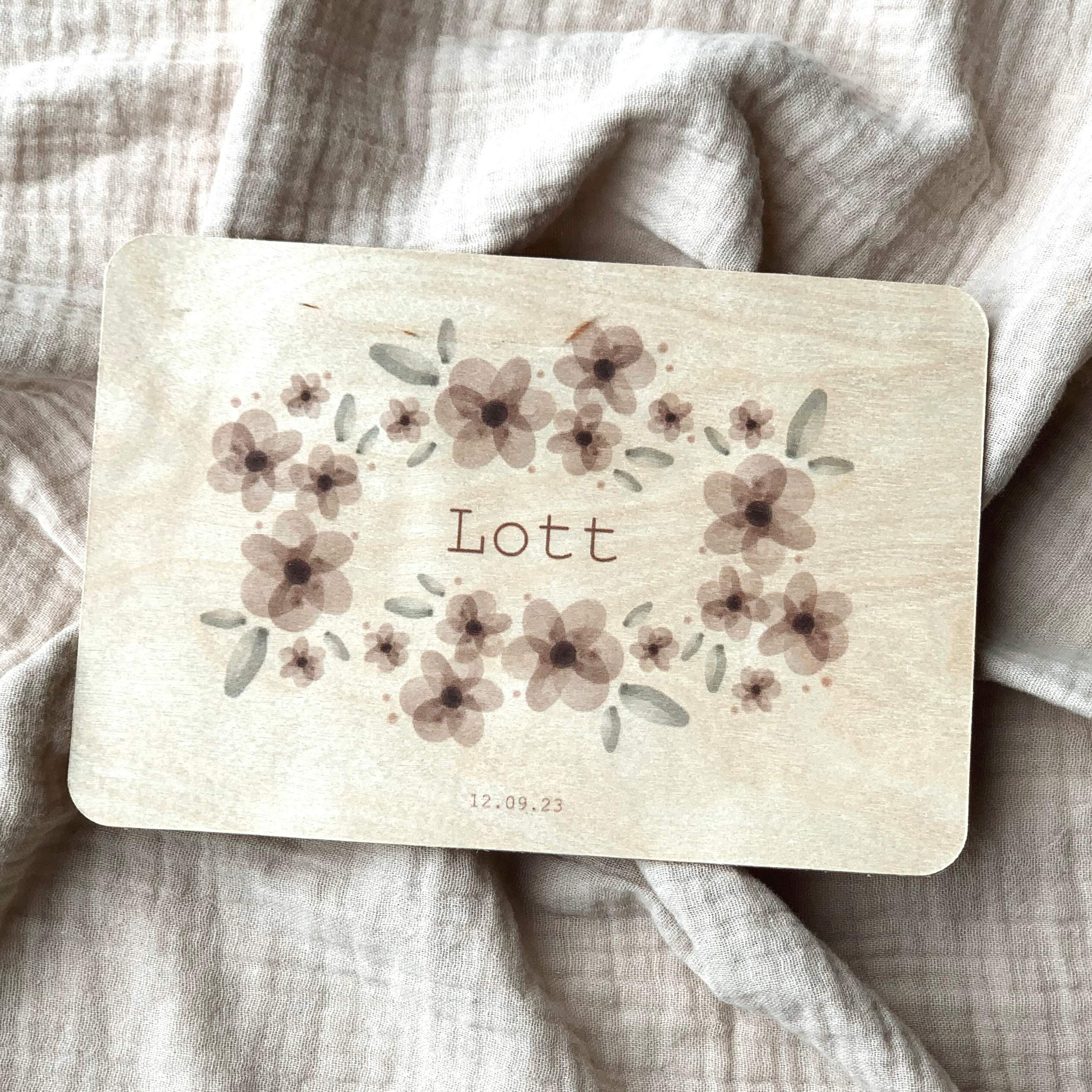 Dit lieve geboortekaartje voor een meisje kan je drukken op echt hout. Het kaartje kun je aanpassen naar wens. Lott