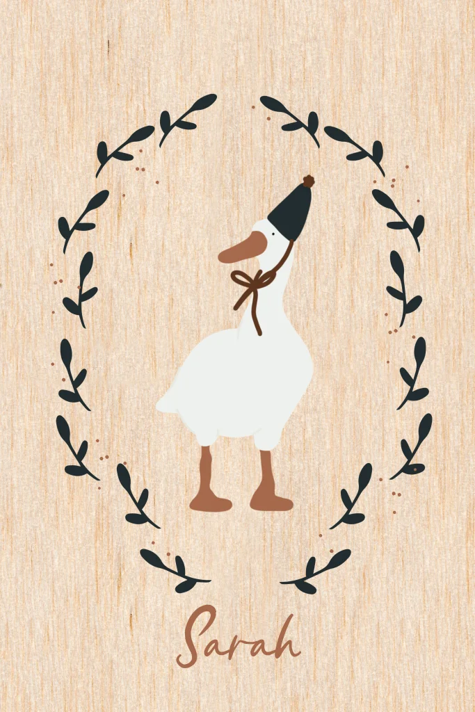 Dit geboortekaartje op hout met illustratie van een gans met feestmuts kun je zelf aanpassen naar wens en smaak voor jullie kindje. Sarah