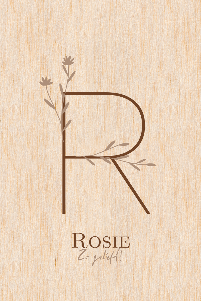 Dit geboortekaartje voor een meisje met letter in goudfolie en bloemen kun je zelf aanpassen naar wens en smaak. Het kaartje is gedrukt op echt berkenhout. Je kunt alle kleuren zelf aanpassen naar wens.