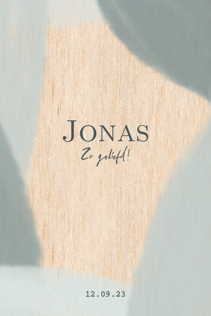 Geboortekaartje op hout voor een jongen. Met blauw grijs groene watercolour vegen.