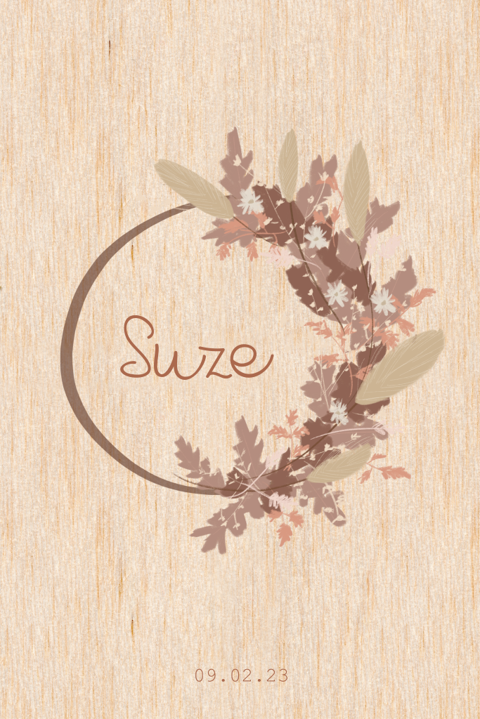 Dit geboortekaartje op hout voor een meisje kun je zelf aanpassen naar wens en smaak. De bloemenkrans met droogbloemen verplaatsen of vergroten of verkleinen. Zo maak je een uniek geboortekaartje voor jullie meisje.