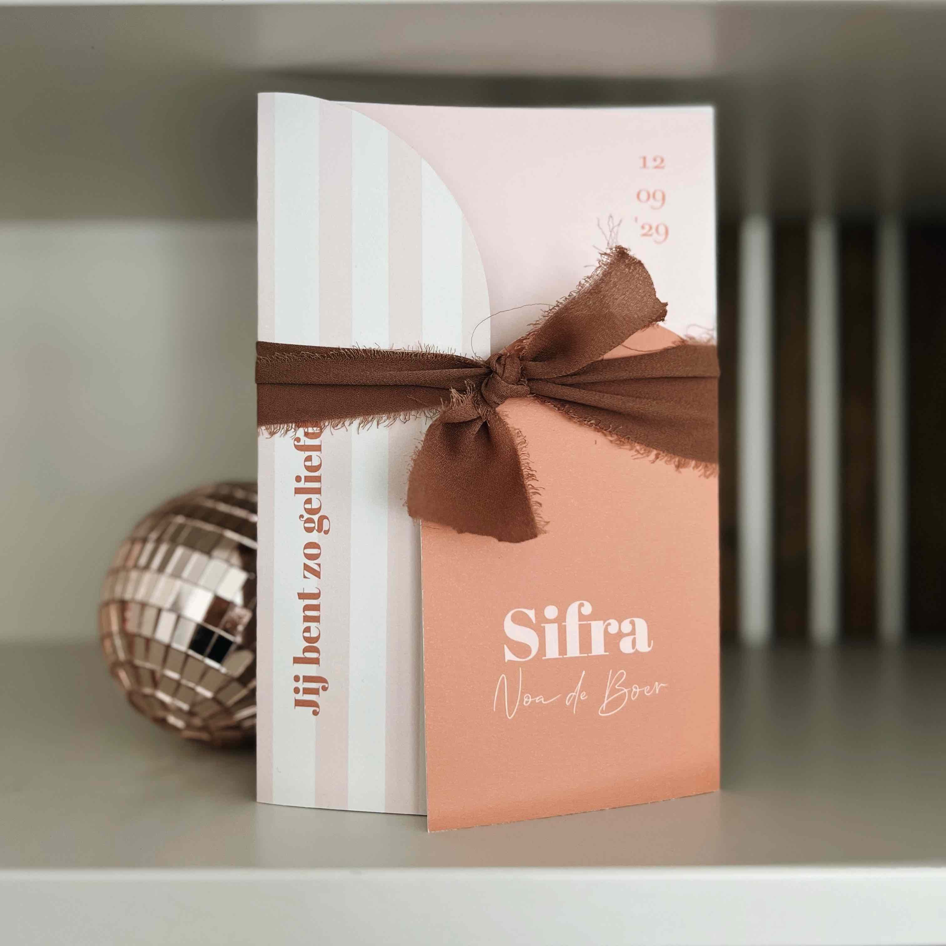 Dit geboortekaartje is een insteekhoes in oranje kleuren met roze en witte strepen. De tekst en de kleuren kun je helemaal aanpassen naar wens.