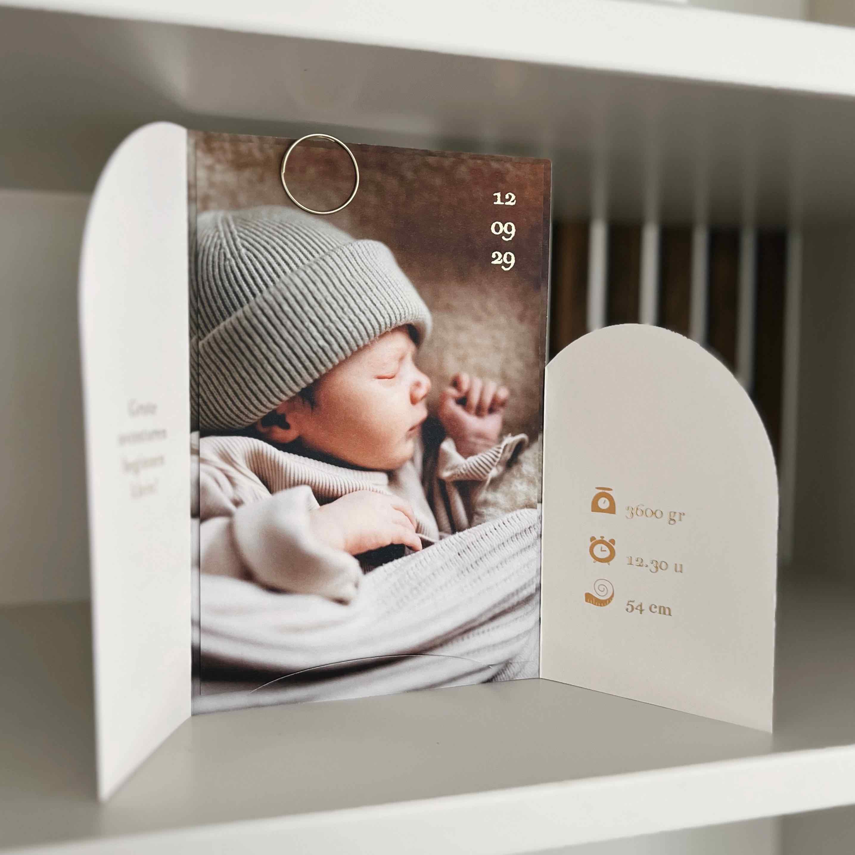 Dit luxe geboortekaartje bestaat uit een insteekhoes met een losse inlegkaart met een mooie foto erop. Alles in dit hoesje en van de intsteekkaart kun je aanpassen naar wens. De hoes kun je dichtdoen door middel van een paperclipje. Maar het staat ook heel tof als je dit met een lint doet.