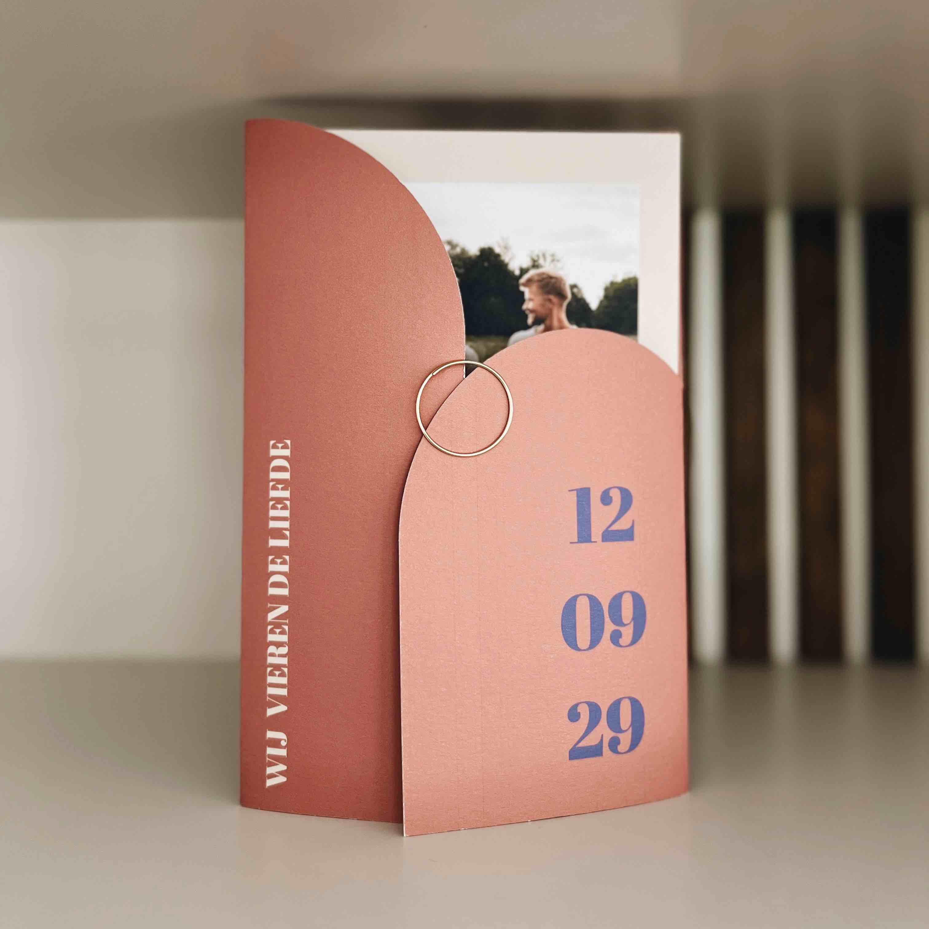 Deze trouwkaart in de vorm van een insteekhoes in roze oranje kleuren in combinatie met paars en blauw kun je zelf helemaal aanpassen naar wens.
