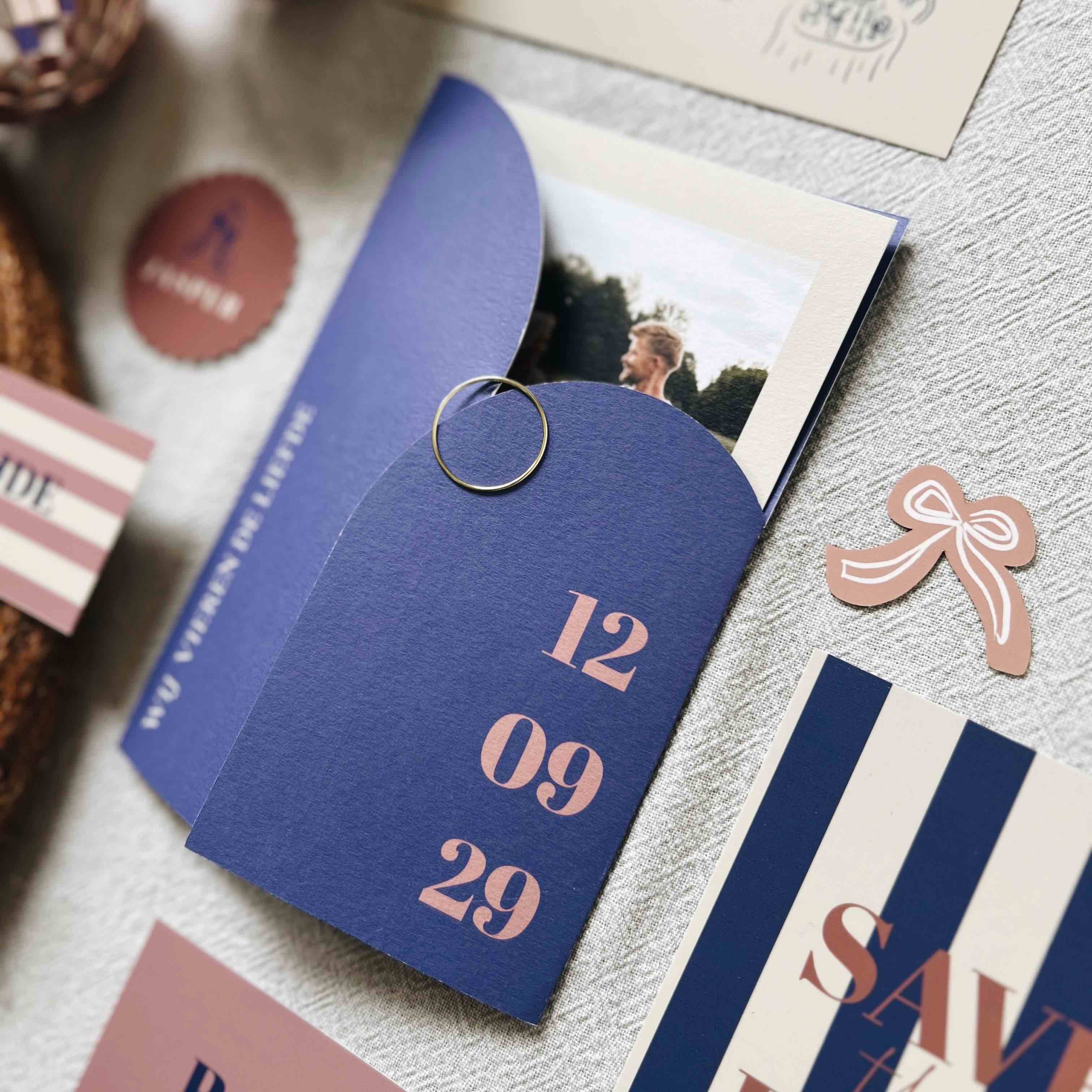 Deze stoere trouwkaart insteekhoes in blauw paarse kleur met roze tekst kun je zelf helemaal aanpassen naar wens.