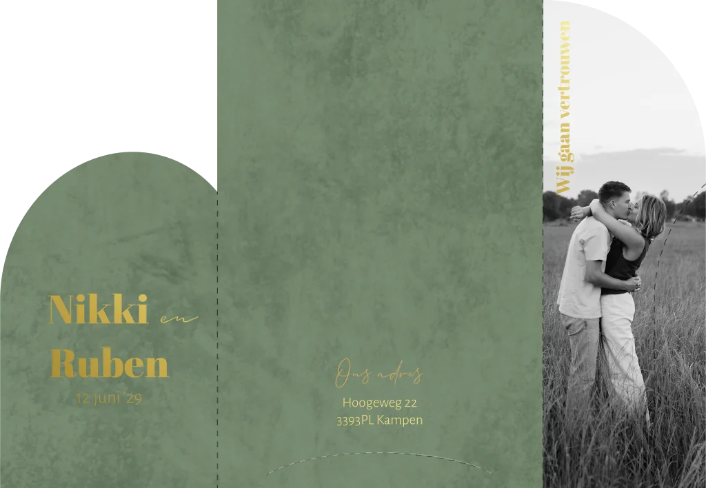 Trouwkaart insteekhoes groen en goudfolie met boogvorm