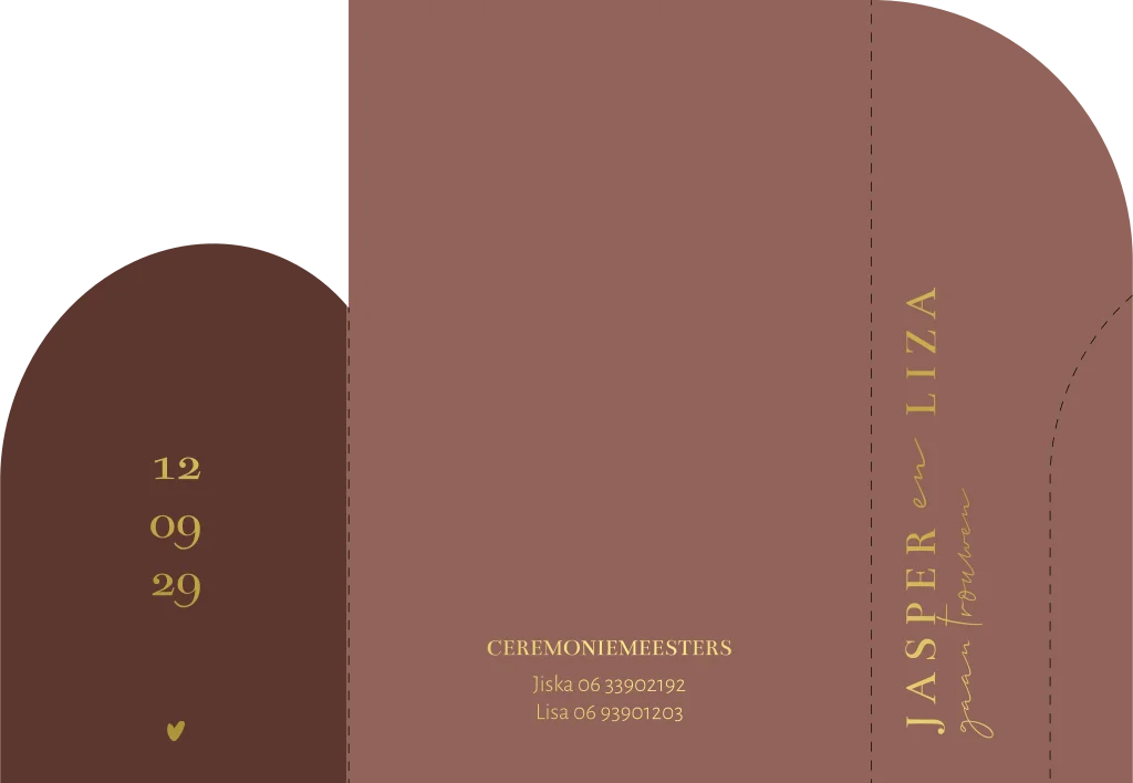 Deze trouwkaart in luikvorm met boogvorm bovenaan in rood en roze kleuren kun je aanpassen met tekst in goudfolie. Jasper