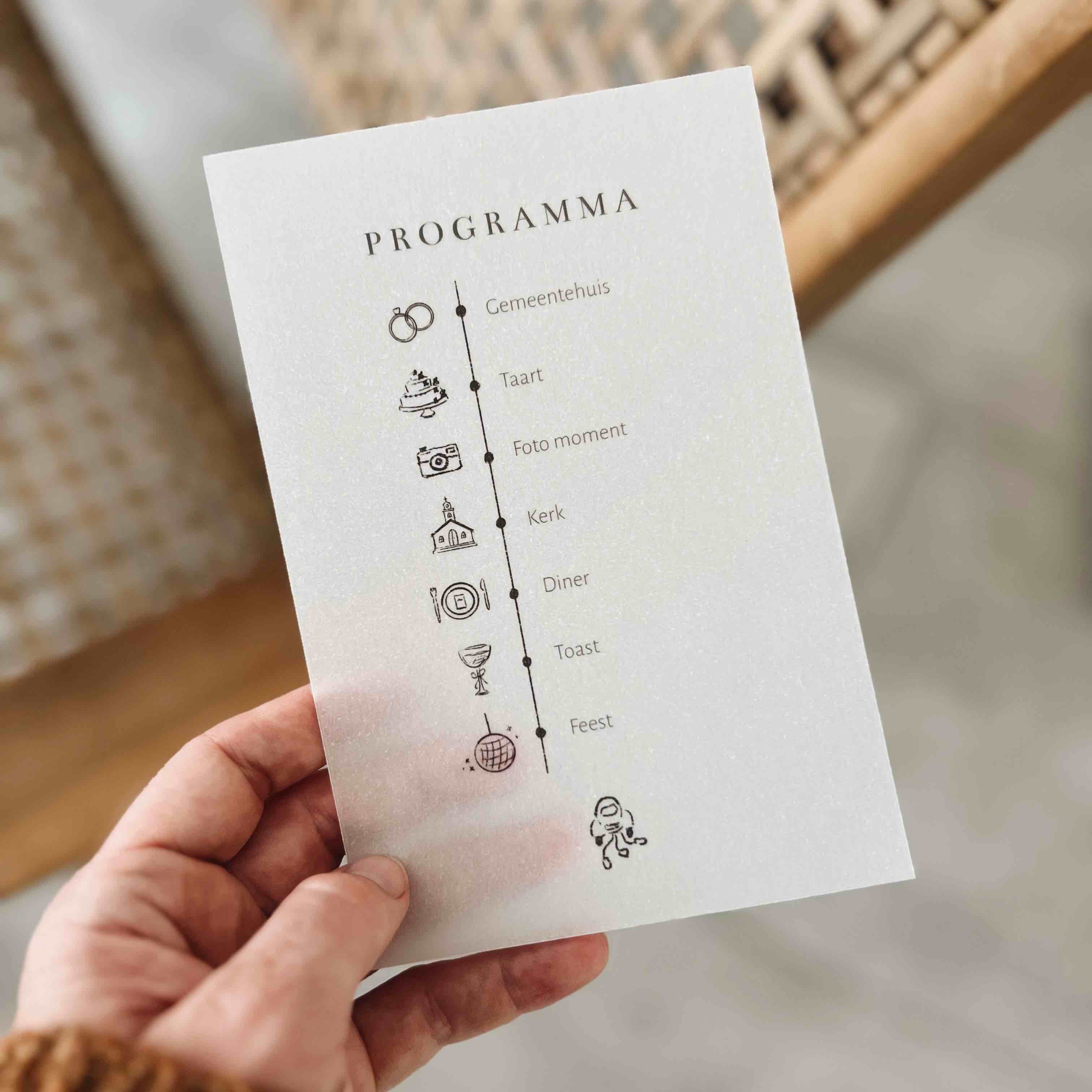 Hoe tof om een dagprogramma op doorzichtig kalkpapier voor jullie bruiloft mee te sturen naar jullie daggasten zodat zij precies weten waar ze aan toe zijn op deze mooie dag.