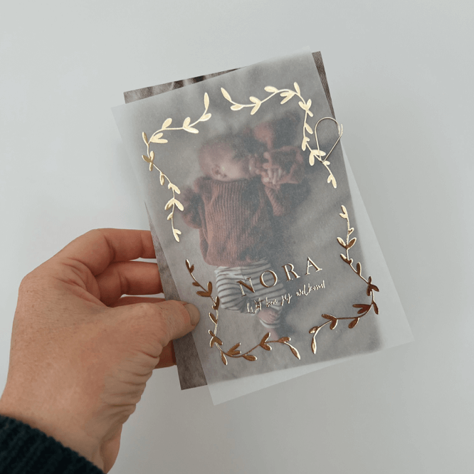 Geboortekaartje kalkpapier goudfolie en een newbornfoto