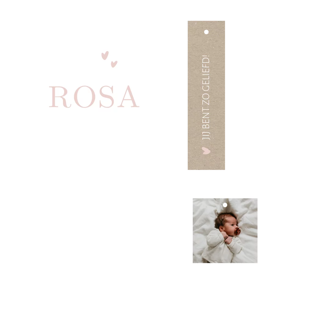 Een klassiek geboortekaartje voor een meisje met roze en hartjes in combinatie met een stoerder kraftlabeltje en fotolabeltje. Je kunt dit hele kaartje aanpassen naar wens en dan alle labeltjes samen binden met een mooi touwtje.