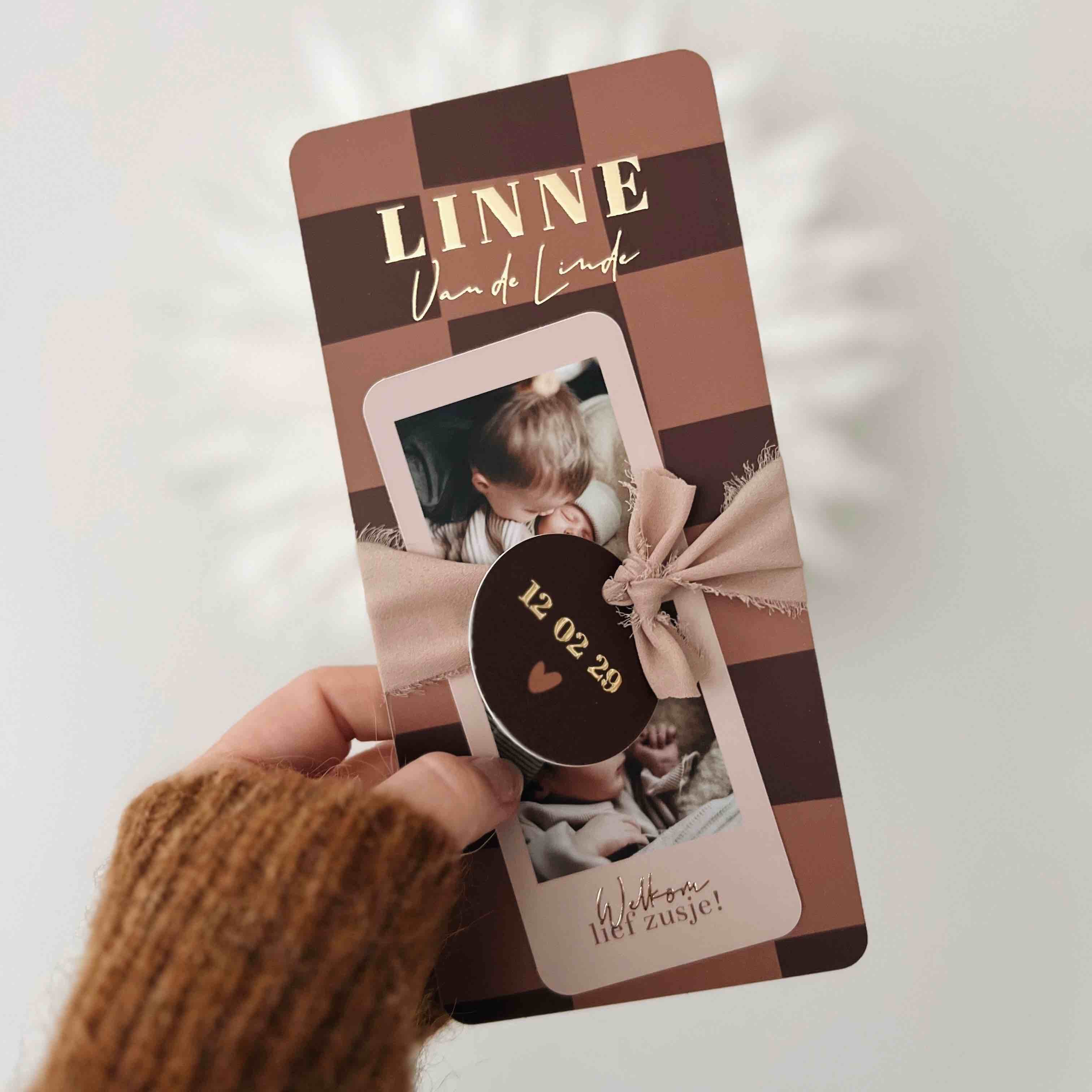 Een geboortekaartje voor een meisje met blokjes print en losse fotostrip en rond labeltje. Met tekst in goudfolie. Helemaal te bewerken naar wens.