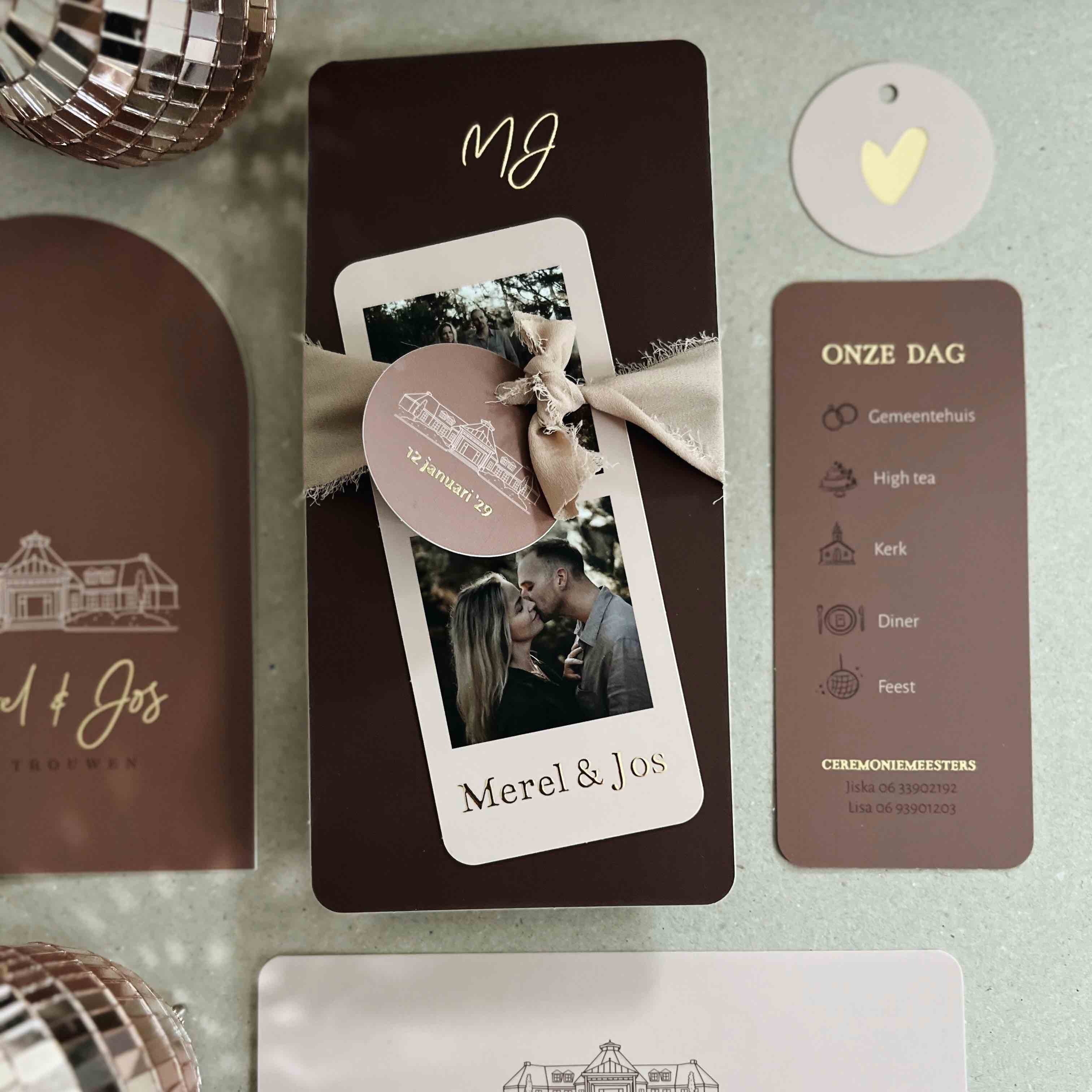 Een langwerpige trouwkaart met twee losse kaartjes erbij. Een rond labeltje waarbij op dit voorbeeld een lijntekening van de trouwlocatie staat maar ook een fotostrip waarbij op de andere kant een tijdslijn van jullie bruiloft staat.