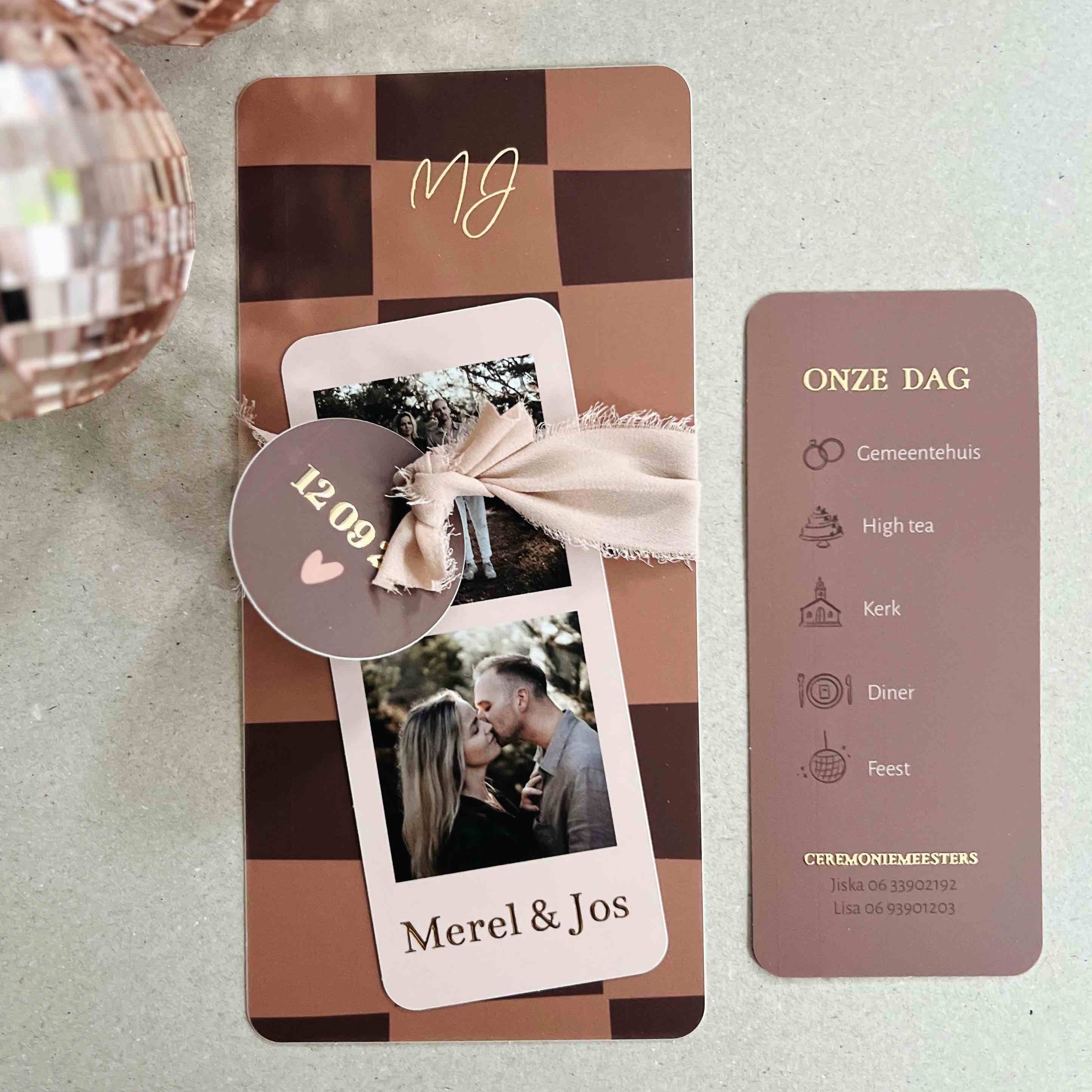Trouwkaart met blokjes print goudfolie oranje rood en fotostrip