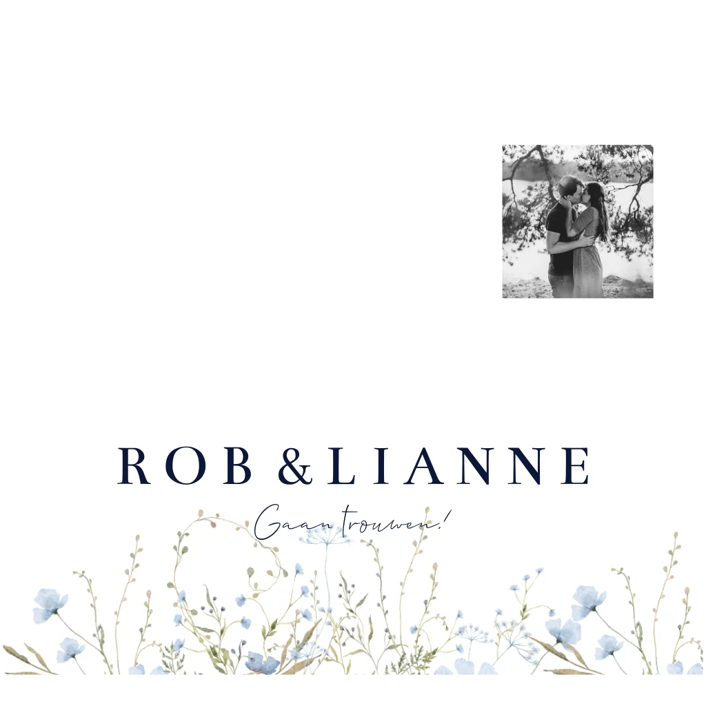Trouwkaart met blauwe watercolour bloemetjes en foto
