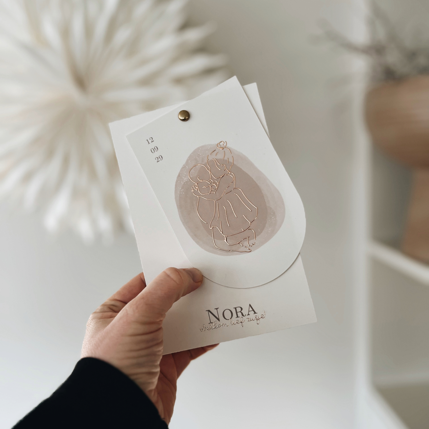 Dit labelkaartje voor een meisje kun je zelf aanpassen naar wens en smaak. Je ziet nu een grote zus met haar kleine zusje op de dit geboortekaartje. Je kunt de lijntekening aanpassen naar jullie eigen gezinssamenstelling. In de editor vind je onder het mapje 'broertjes en zusjes' al heel veel verschillende tekeningen. Maar mocht je nog wat missen mag je ons altijd mailen.