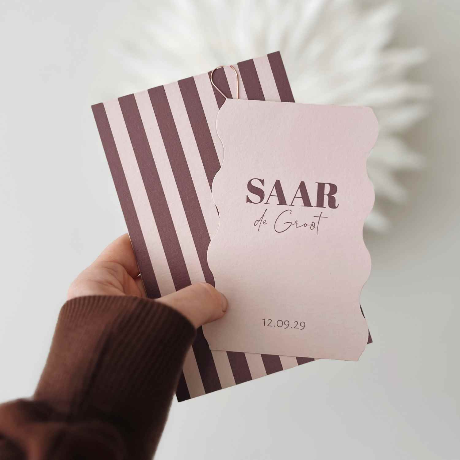 Geboortekaartje met roze streepjes en losse golvende kaart