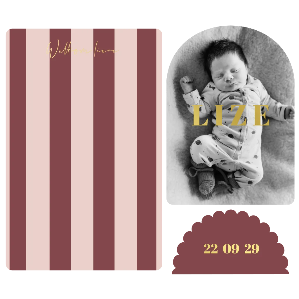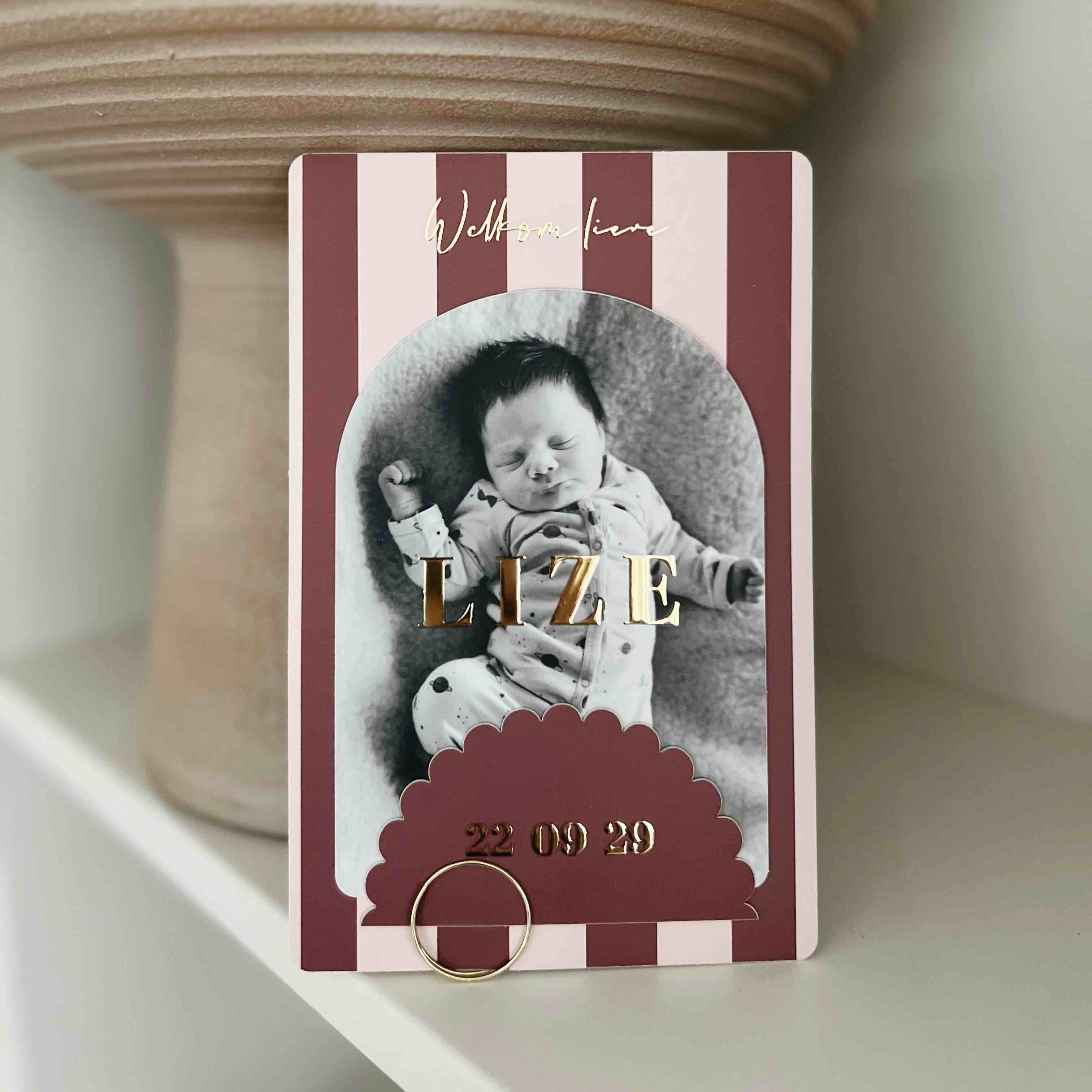 Een lief geboortekaartje voor een meisje met een basis kaart met licht roze en donker roze strepen en een klein kaartje in bloem vorm met goudfolie en een foto van @thestoryteller.nl