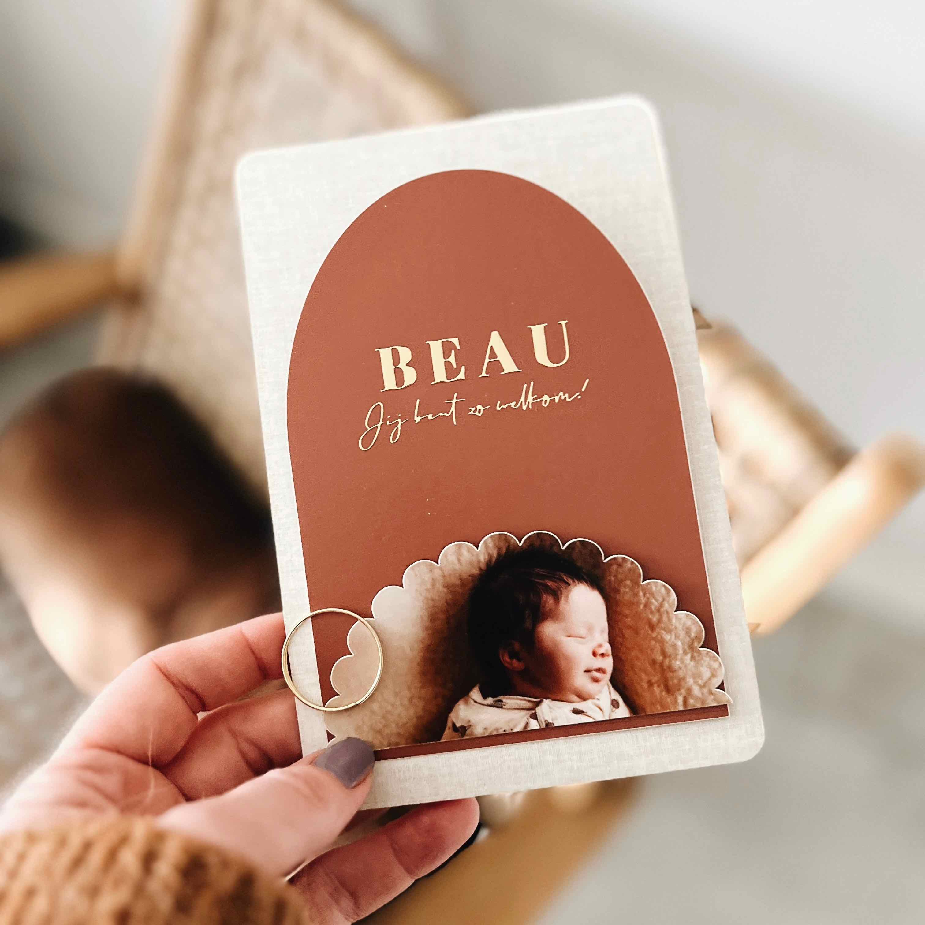 Dit geboortekaartje voor een jongen of meisje is stapelset bestaat uit 3 losse kaartjes in de in de kleuren oranje, goudfolie en Linnen.
