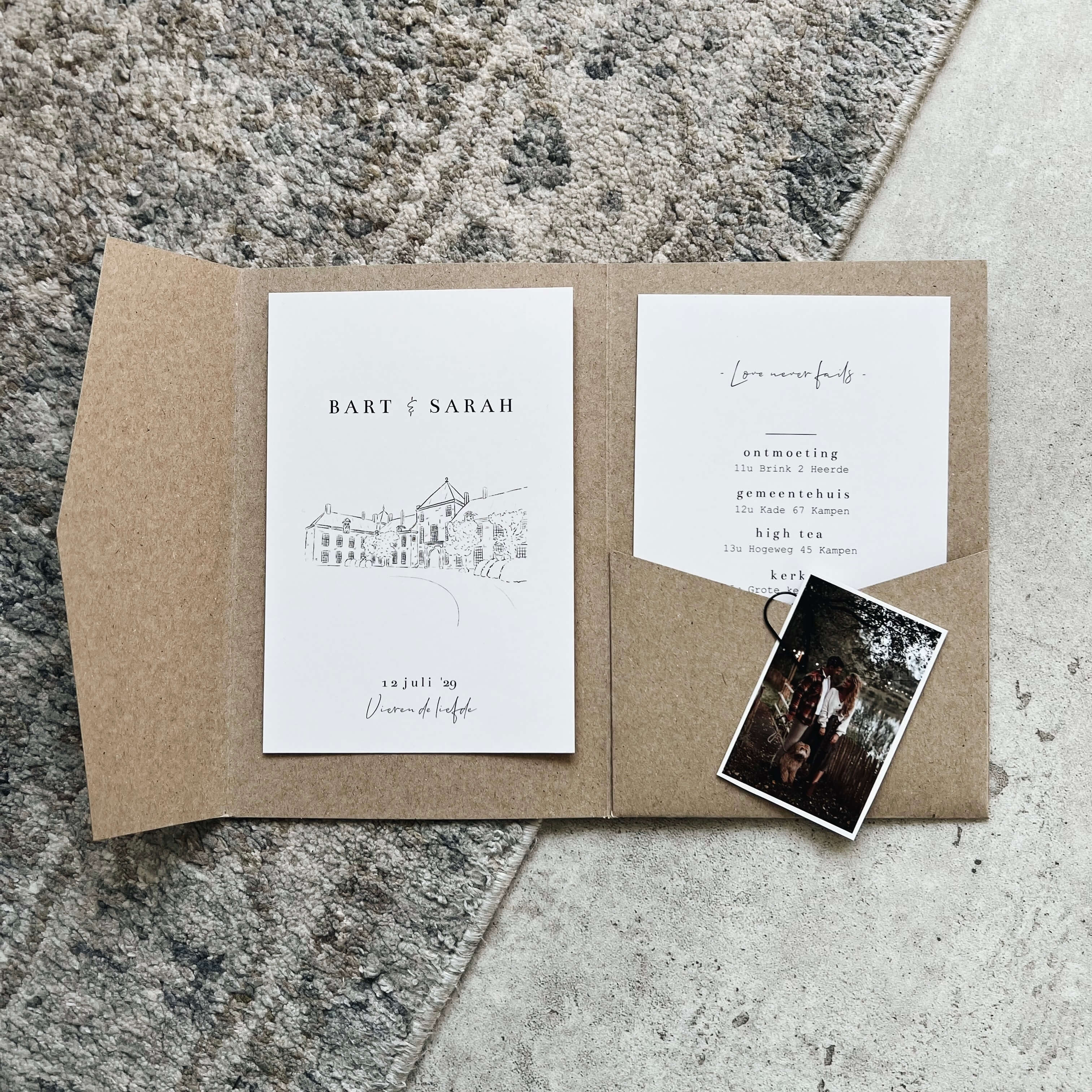 Luxe trouwkaart pocketfold met tekening trouwlocatie minimalistisch