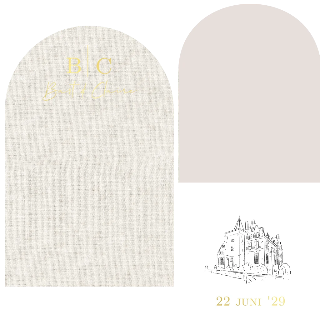 3 losse boogvorm kaarten op elkaar gestapeld met lijntekening trouwlocatie kasteel Wijenburg in Echteld. Beige linnen Look tinten met goudfolie.