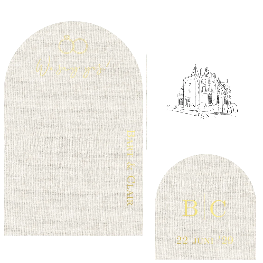 3 stapelkaarten in boogvorm met lijntekening trouwlocatie kasteel Wijenburg in Echteld. Linnen look komt het mooiste uit op Linnen papiersoort. De trouwlocatie kunnen we op maat voor je tekenen.