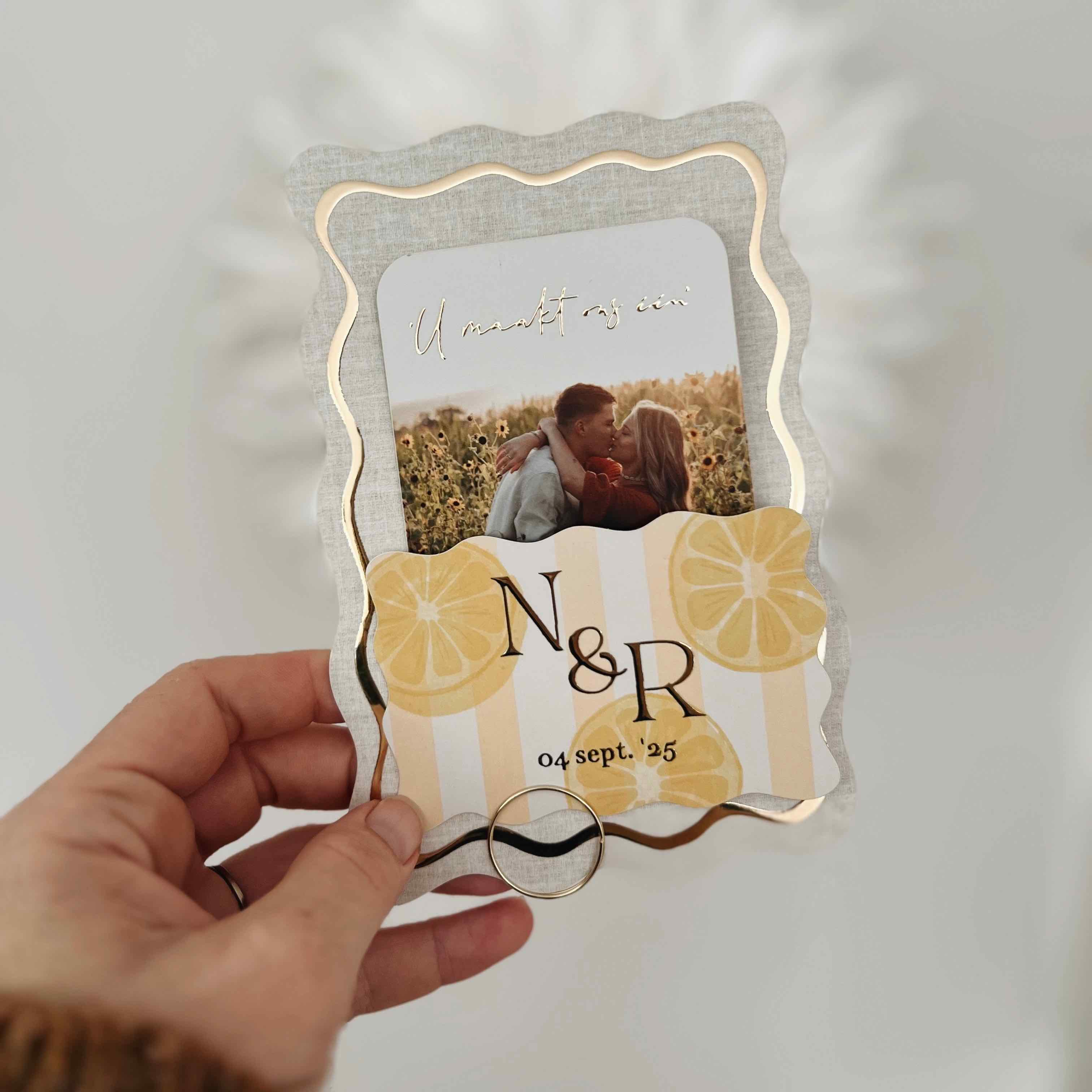 Trouwkaart met citroentjes linnen en goudfolie in Italiaanse stijl