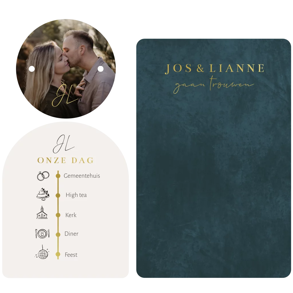 Trouwkaart dagprogramma goudfolie ronde foto en donkerblauw