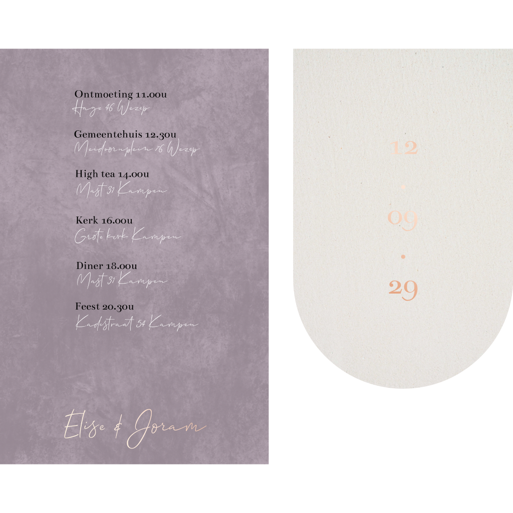 Trouwkaart lila paars labelkaart kraft met rosefolie