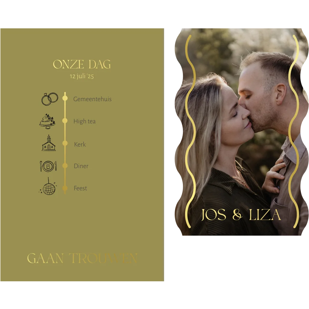Deze trouwkaart bestaat uit twee losse labels. De voorste is met golfjes en foto met de golvende rand met goudfolie. Dit kun je zelf aanpassen naar wens.