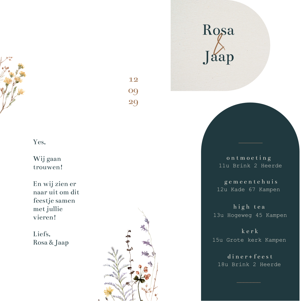 Trouwkaart met 3 kaarten dagprogramma en label met veldbloemen