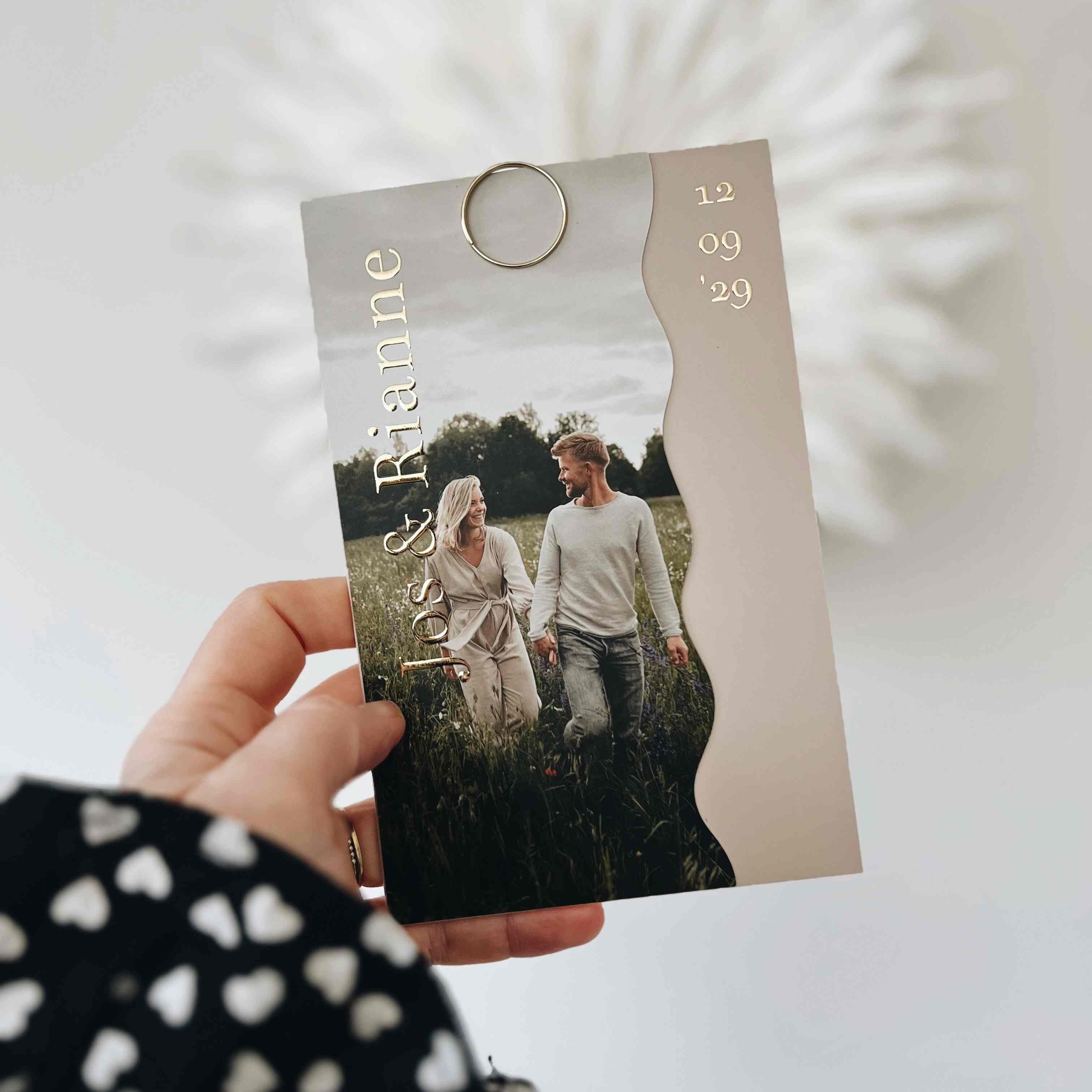 Trouwkaart met golfjes foto en goudfolie met dagprogramma