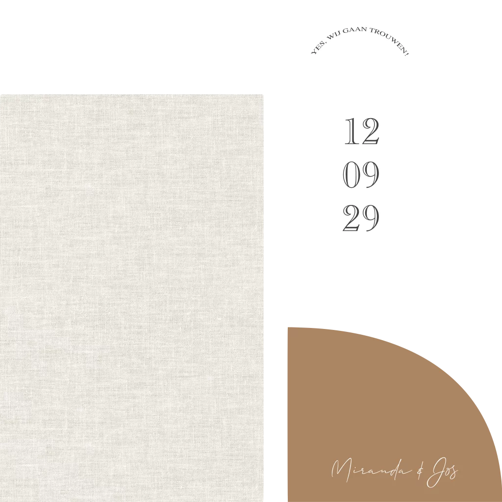 Deze trouwkaart met verschillende labels kun je zelf helemaal aanpassen naar wens en smaak. De linnen achtergrond van de basiskaart kun je een andere kleur geven. Net zoals het oranje kaartje en het witte kaartje. Ook kun je spelen met de lettertypes, zo maak je er een unieke trouwkaarten set van.