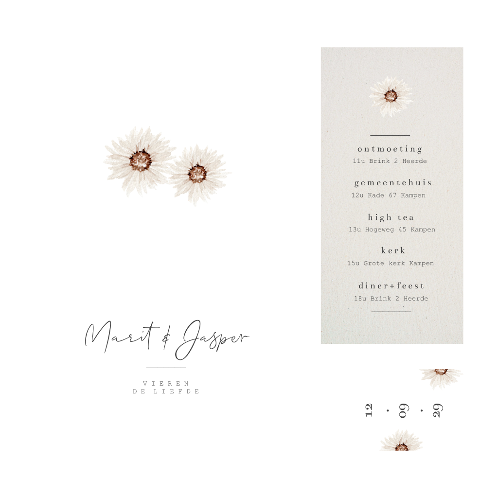 Trouwkaart met losse labeltjes witte bloemen madeliefjes kraftlook