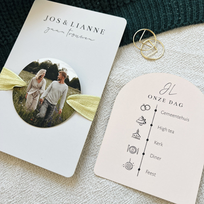 Deze trouwkaart bestaat uit 3 kaartjes. Het ronde label met de foto kun je vast maken met een mooi lintje.