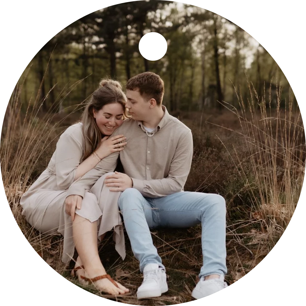 Dit ronde labeltje met foto kun je mooi aan de trouwkaart bevestigen met een touwtje.
