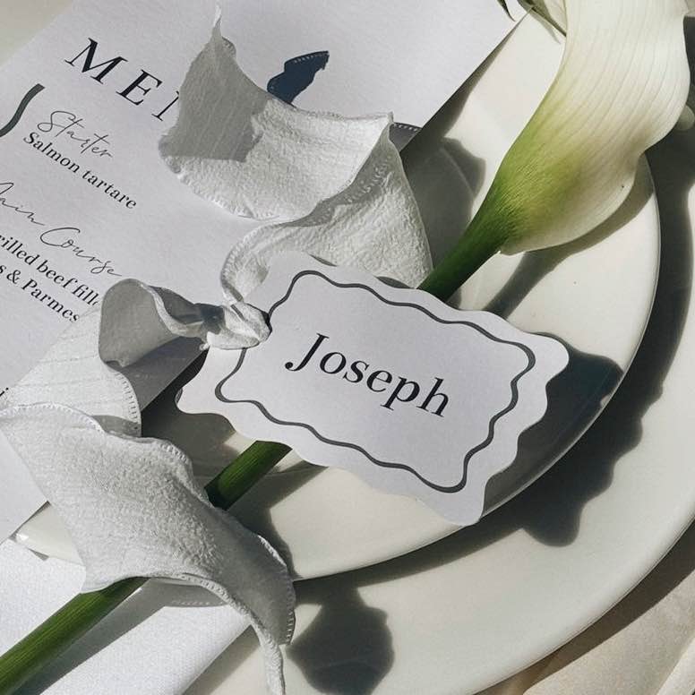 Naamkaartjes met golvende rand voor tafelstyling bruiloft