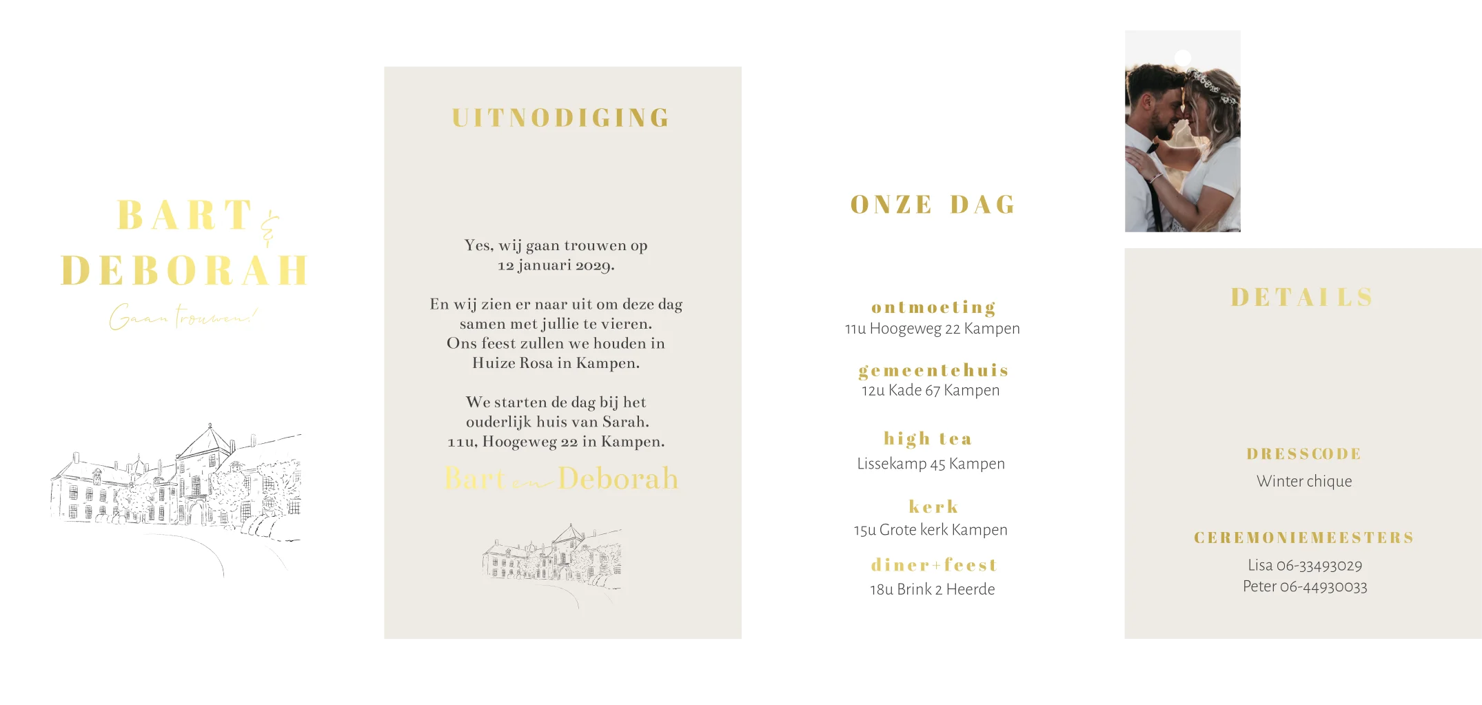 Trouwkaart pocketfold beige wit goudfolie en lijntekening trouwlocatie