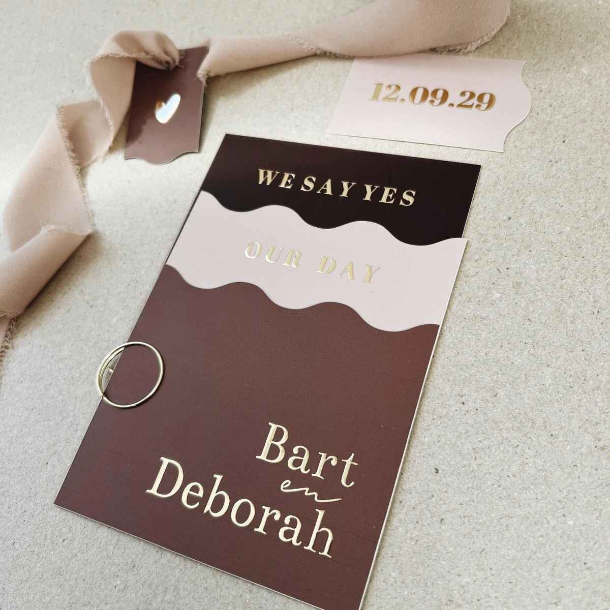 Trouwkaarten stapelset kaartjes met golven in roze bruin en goudfolie