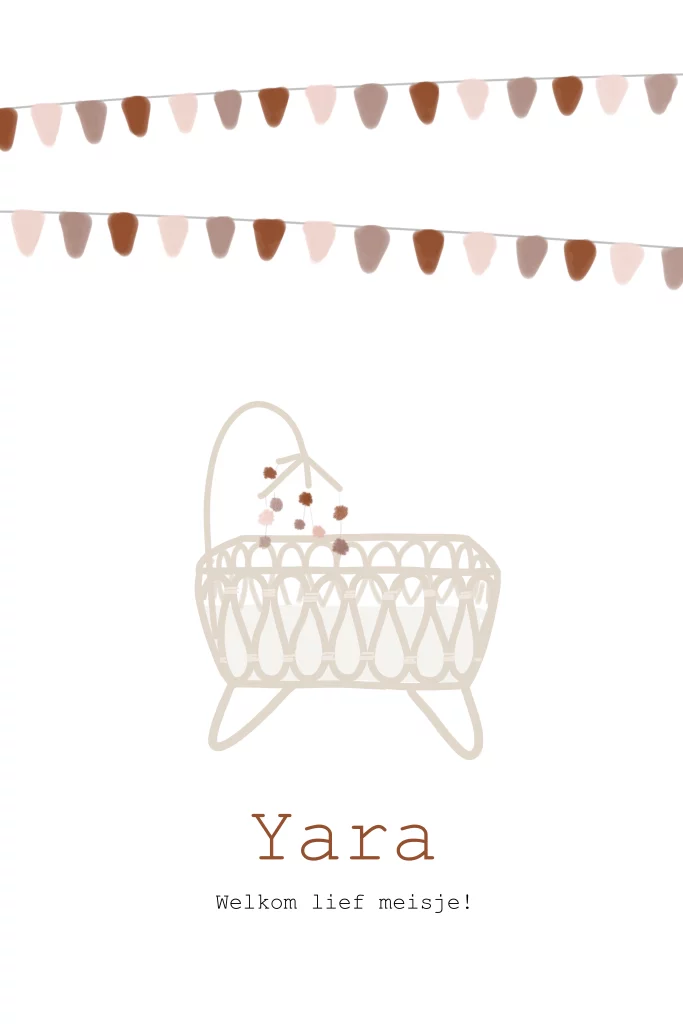 Geboorteposter voor een meisje met retro rotan wiegje en vlaggetjes