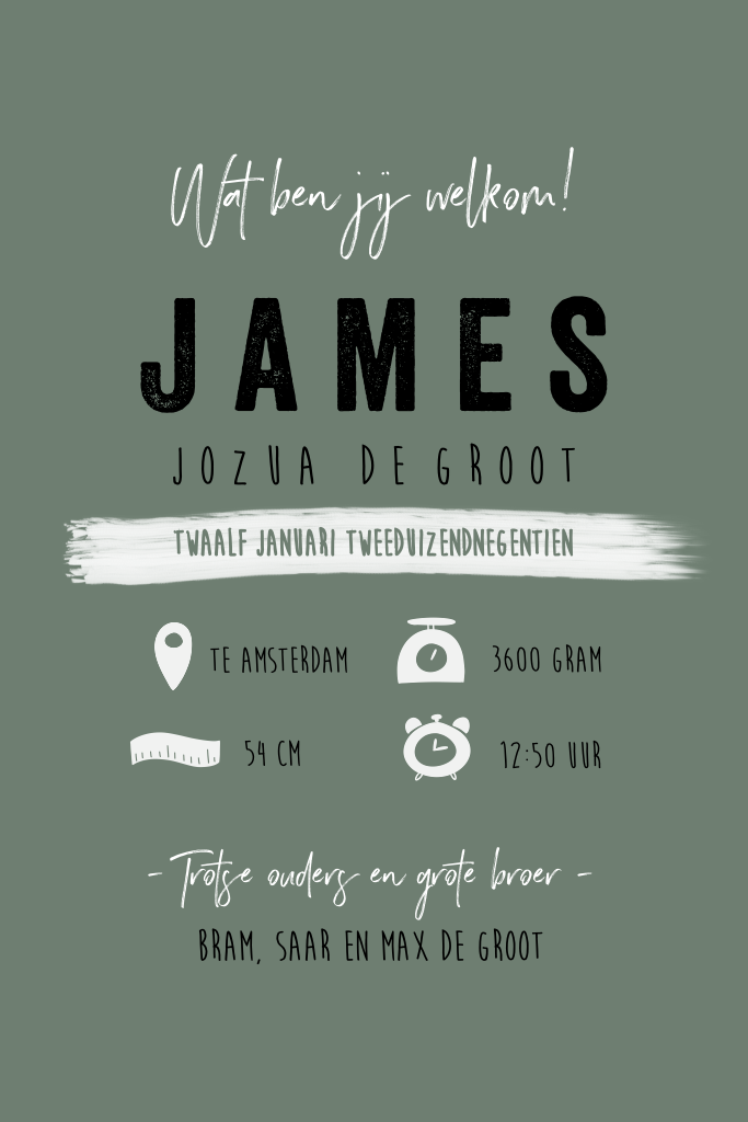 Deze geboorteposter heeft een stoere uitstraling door de zwarte letter en de verschillende lettertypes. Leuk om in te lijsten voor de babykamer. De poster is gemaakt van het geboortekaartje. Je kan hem zelf aanpassen naar wens.