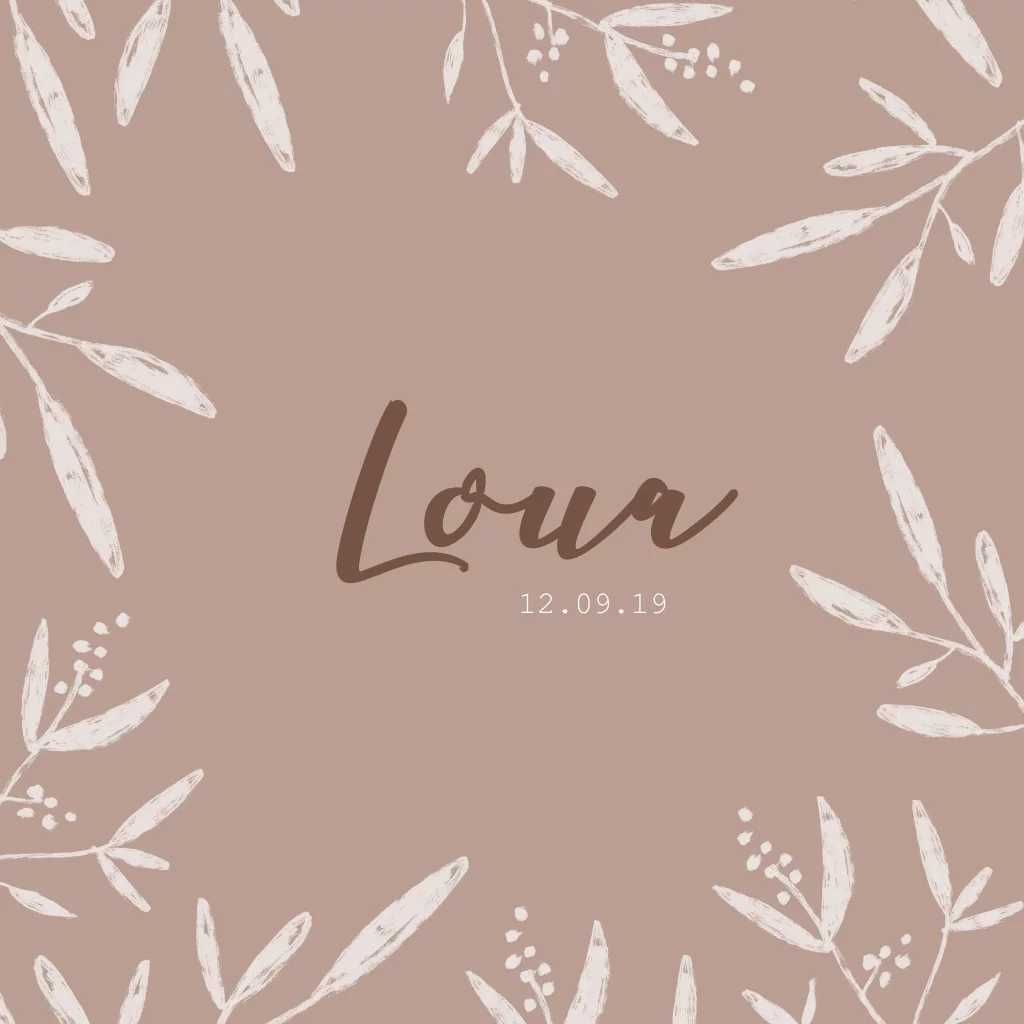 Deze geboorteposter heeft een lieve uitstraling door de combinatie van oudroze, de bruintint en de tekeningetjes. Je kan de poster helemaal eigen maken. Er kunnen andere kleuren gebruikt worden en je kunt de takjes bijvoorbeeld vermeerderen of verminderen. Super leuk om een poster te hebben van het geboortekaartje. Ook leuk als kraamkado.