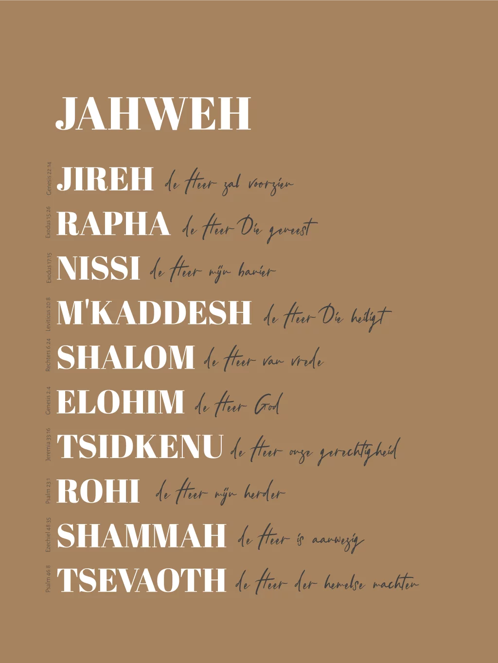 Deze grote poster met de namen van God in het Hebreeuws plus uitleg kun je helemaal aanpassen naar wens. Ook de oranje achtergrond en de kleur van de letters.