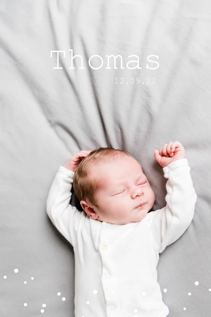 Geboorteposter voor jongens met foto en stipjes met naam in goudfolie