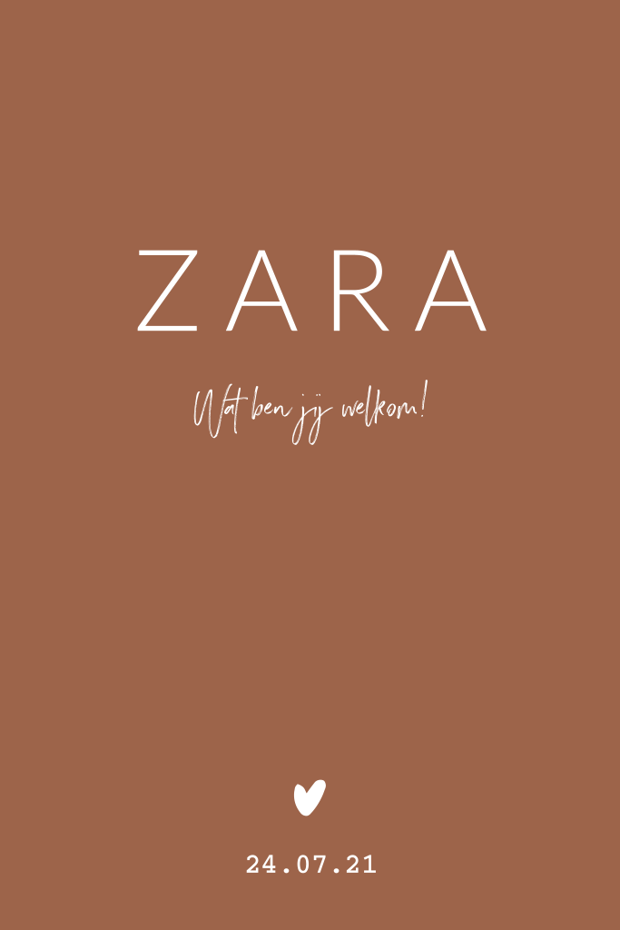 Dit lieve geboortekaartje is gemaakt voor een meisje en is omgezet naar een geboorteposter! De poster kan ook zeker voor een jongen. De roestbruine achtergrond en het hartje en de tekst in foliedruk kun je zelf aanpassen. Je kunt kiezen voor goudfolie, koperfolie, roséfolie of zilverfolie. Leuk om te geven als kraamkado en waardevol om het geboortekaartje zo te bewaren.