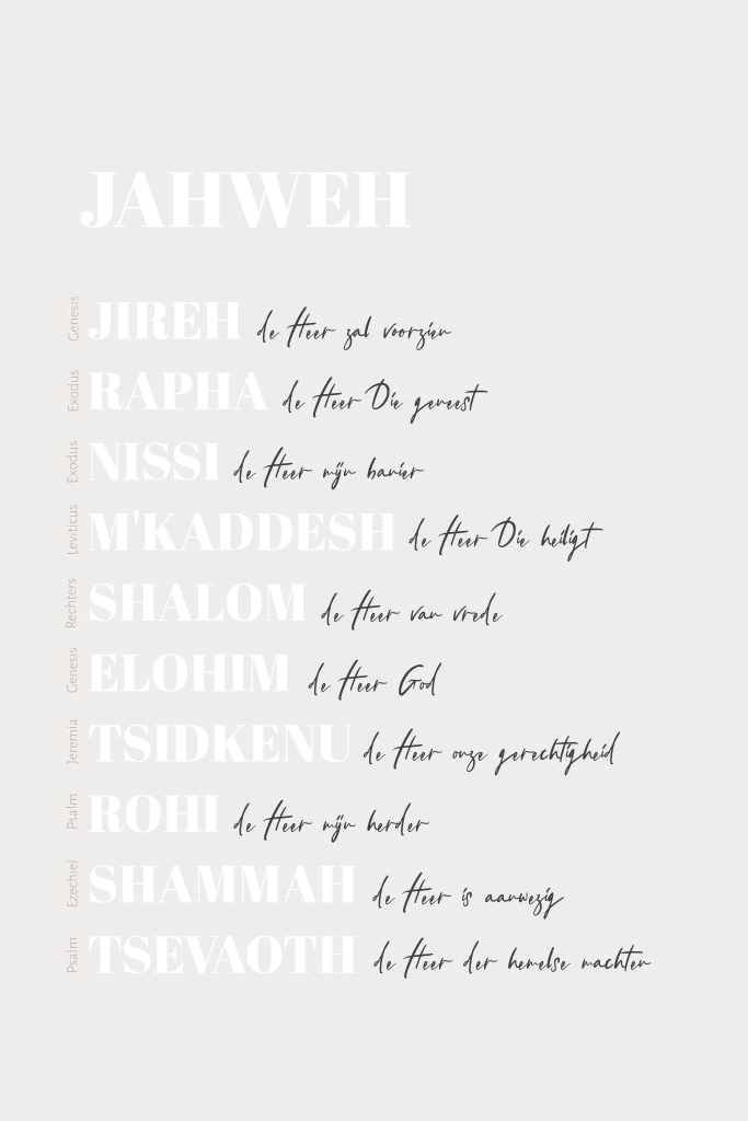 Deze A4 poster met de namen van God in goudfolie druk kun je zelf helemaal aanpassen naar wens. De kleuren en het lettertype :)